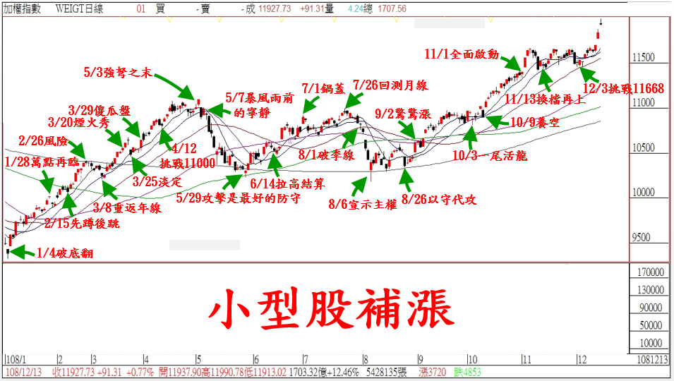 中、美貿易戰的利多助攻下,台北股市早盤大漲+101點開出,盤中一度大漲+154點,直接逼近12000點大關;不過在獲利賣壓放大下,漲勢稍作收斂,終場指數上漲+91點作收,收在11927點,成交量1707億。