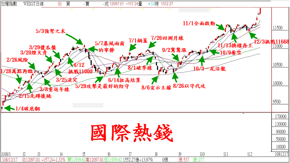 加權指數今天大漲+157點,相信早盤收盤訊息的家族會員都沒有什麼意外;早上我們就說…今天已經提前出現『軋空結算』,預估指數壓回空間有限,終場會維持中紅以上作收。雖然本周『拉高結算』就是預期中的結果,但是在台幣強升下;台股今天震盪走高的型態,就是典型的『軋空結構』。目前對投資朋友最常問的問題:『漲完沒?!』;對於這個問題,武傑還是要說:『不要預設高點』!!主要原因還是因為『國際熱錢』不斷湧入台灣,在熱錢鎖定權值類股下,短線指數『看回不回』是個常態;對投資人而言,依舊還是擇優佈局…『有回要買,不回還是要買』!!