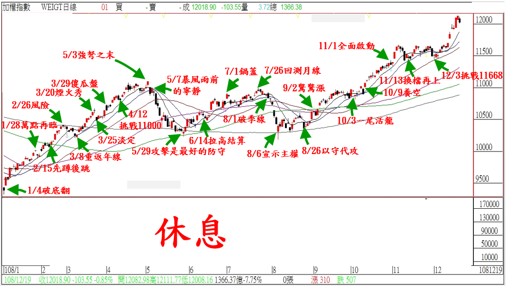 台指期結算過後,台北股市早盤小跌-39點開出,雖然在大立光的接棒轉強下,指數一度重回12100點;但是受到台積電貼息影響,指數震盪走低,終場大跌-103點作收,收在12018點,成交量1362億。