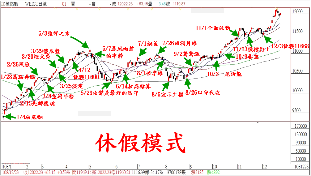 聖誕節前夕,台北股市早盤小漲+10點開出,在量能快速萎縮下;加權指數全場在平盤上狹幅震盪,尾盤台積電強力拉高下,終場上漲+63點作收,收在12022點,成交量1116億。