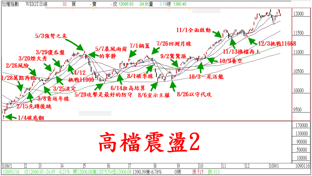 延續我們昨天的規劃…在『中美貿易戰』的第一階段協議和台積電法說;預料這二項難有重大變化下,預料在下週封關前,盤勢將『高檔震盪』,個股快速輪動。今天在半導體重挫下,從技術面來看,台股呈現一個『回測月線』的動作;基本上盤勢的結構面依舊處於量縮整理,所以整體結構並沒有改變。封關前夕,選股不選市;操作上急漲不追,逢低買好股即可。
