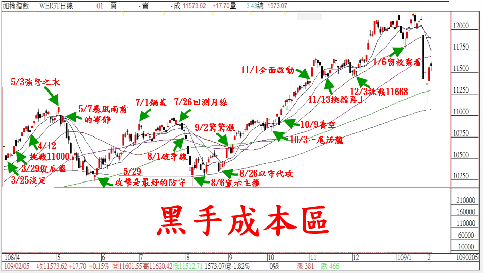台股今天成功突破五日均,小漲+17點作收。但是就今天指數的表現來看,相信不少投資人會問:「相對於美股的大漲,台股的表現是不是漲不動了?!」。對於這個問題…武傑還是要說:『看法不變…挑戰季線』。對於急跌的行情,五日均線可以是『信心指標』;雖然台股的漲勢,沒有跟上美股的漲幅。但是重點在於幾次的震盪,已經讓11500點以下,形成『黑手成本區』。所以對於下半周的盤勢規劃…多頭反擊看法不變,短線依舊還是『挑戰季線』。