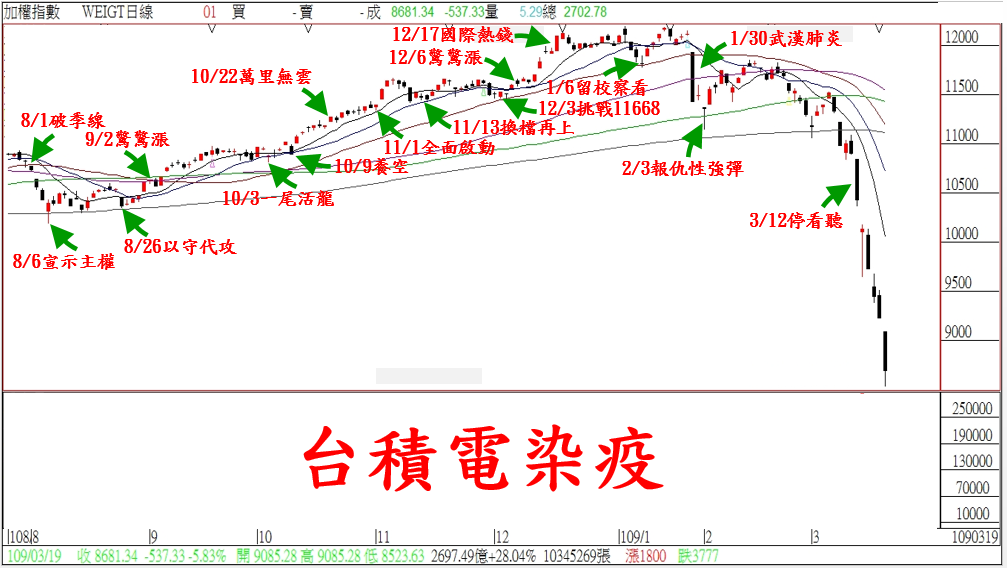 今天在『台積電染疫』的重擊下,讓台北股市盤中重挫逼近-700點。『武漢肺炎』疫情在台灣擴散下,短線多方信心再次受到打擊;但是不能否認的是…不少內資所主導的個股,已經出現抄底買盤。因此在面對盤勢的發展,我們反而要積極面對。再加上外資期貨多單已經超過五口萬,武傑還是老話一句…把信心拿出來的時刻到了!!