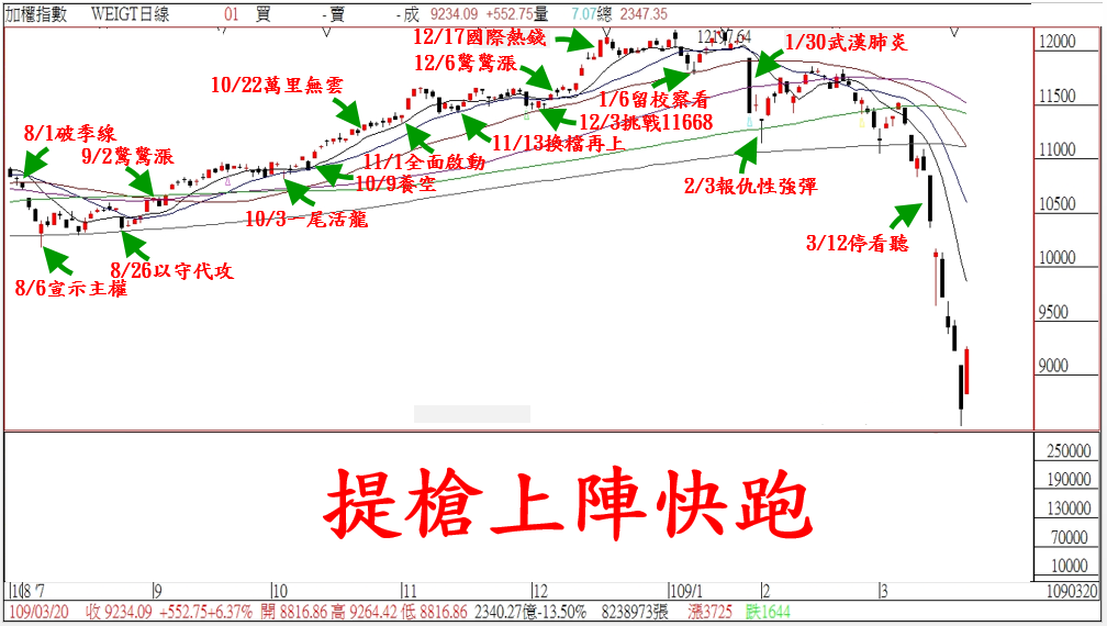把『信心拿出來』!!昨天給大家的信心,話都還沒說完…今天台股在『國安基金』的加持下,一口氣重返9000點大關。只是面對今天的強彈…投資人不免會問:『這會是一日行情嗎?』。對於這個答案…武傑還是站在正面方向。基本上現貨市場從二個交易日前,就已經出現抄底性買盤;特別是今天強彈的個股,不少都是昨天底檔爆量的個股。再加上期貨市場外資依舊超過五萬口多單,顯示被動式資金調節可望告一段落;因此,展望下星期建議投資朋友『提槍上陣快跑』!!