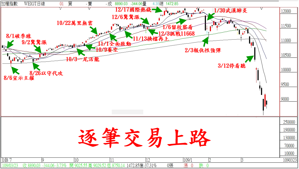 全球持續關注新冠肺炎的後續發展,而台股受到道瓊期重挫熔斷影響,加上逐筆交易上路今日上路,投資人觀望氣氛濃厚,雖然仍有國安基金護持與禁空令加持,但早盤仍一度大跌483點,隨後陸續有買單進場,終場跌點收歛至下跌-344點,成交量萎縮至1,468億。