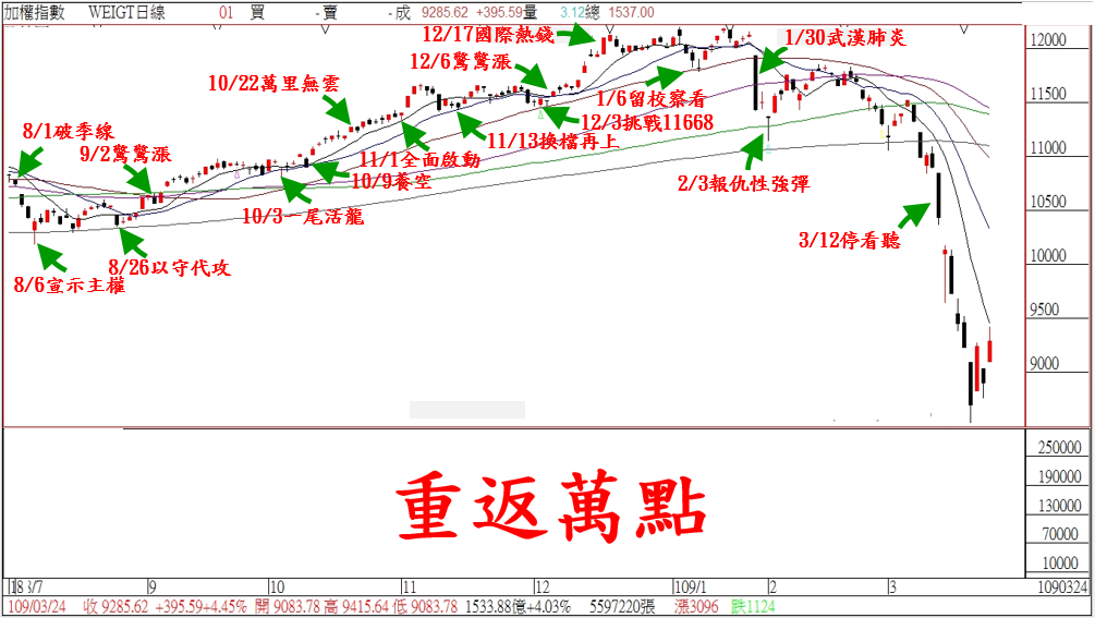 外資超過+5萬口的多單,終於在今天一如我們上星期的預期;外資在現貨市場開始轉賣為買,僅管只是小買+52億,但預料這只是個開始。今天初步已經重返五日均線,短線多頭持續反擊;再加上量能依舊還是萎縮,短線至少可望『重返萬點』!!