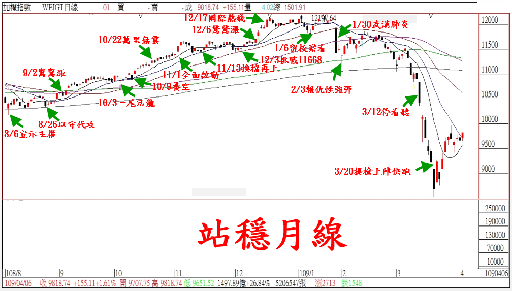 清明連假過後,台北股市一如預期…『跳起來』!!加權指數在三大法人同步買超下,重返9800點大關,並且離月線也僅僅一步遙。對於今天的盤勢,基本上沒有太大分析空間;主要原因還是在於台股結構依舊不變,老話一句…外資賣壓出盡之際,整個報仇強彈結構還沒有結束。所以今天不過就是清明連假過後,市場買盤『全面擴散』的結果;因此,展望本周台股,預期在今天『跳起來』只是開始。預料本周台北股市將可望『站穩月線』!!