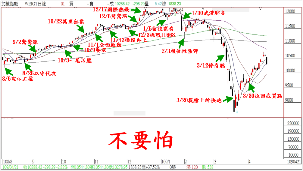 上星期五我們才說…展望這星期,基本上指數的壓力還是很大;但是考慮到近期消息面主導盤勢震盪,所以我們就不過度預期指數走勢。今天破天荒見到『負油價』的表現,讓全球股市大幅拉回;這種消息面的發生,我想是市場預先不會想到的結果。不過,就算今天的大跌,武傑要跟大家說…『不用怕』。指數的回跌有利於籌碼的沉澱,再加上外資今天在期貨市場加碼八千口多單,顯示今天在大跌後,低檔買盤又開始放大。因此,我們視為只是漲多的修正,我們一樣把握機會『拉回找買點』!!