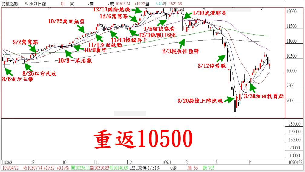 昨天才跟大家說…『不用怕』!!今天在美股重挫下,台股走出強勁的逆轉。基本上台股的結構沒有太大改變,一如我們先前說的…本周籌碼釋放下,指數壓力本來就會比較大;所以對於『負油價』的利空,我們視為空利測底。今天在成功測底後,下半周開始預期盤勢會輪到多方控盤;因此研判短線指數可望先『重返10500』!!