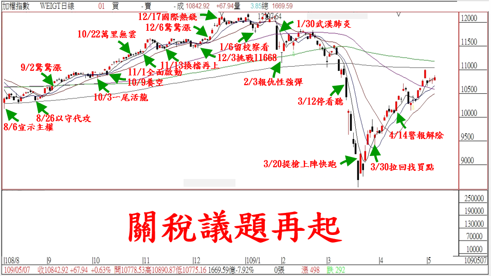 在全球金融市場受疫情影響逐漸淡化,並且許多國家逐步復工、解封的情況下,投資人的信心有稍轉趨樂觀,但川普又來了!再次掀起關稅議題,令市場的多頭氣氛留下了不確定因素。台北股市今天無畏川普的消息,震盪走高上漲+67點作收;從結構上來看,今天台股三大法人合計賣超-7.6億元,小買小賣並未有太大的動作,看起來有些轉趨觀望的態勢,而對於台股目前膠著的情況,武傑認為持續觀察疫情與各國復工、解封的情況,短線上指數仍有回檔的風險,但大家不用過度預測,我們依舊選好績優的個股標的,做為投資的首選,採高出低進的策略,而目前會員手中持股都是一時之選,我們持續獲利,大家只需緊跟武傑訊息即可!!