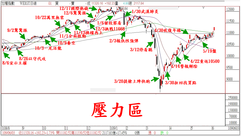 今天台股在熱錢湧入,外資再度大買+176億下,再度大漲+192點。外資開始出現被迫回補的情況,讓台股再度改寫反彈新高;今天從盤中的結構來看,下半場開始,出現了買盤擴散的情況。有別於先前的台股的攻高,只是集中在少數的權值股身上;這部份對整體多方來說,至少是一件好事。只是目前指數在站上11300點後,也進入今年『新冠肺炎』崩跌前的『壓力區』;對於挑戰『壓力區』會不會其它變化?!這些都是目前結構上不確定的地方。不過,可以確定一件事,多頭在這個位置可以說是過河小卒;下半周如果還是沒有明顯壓回,這支強弩還會再多飛一段。