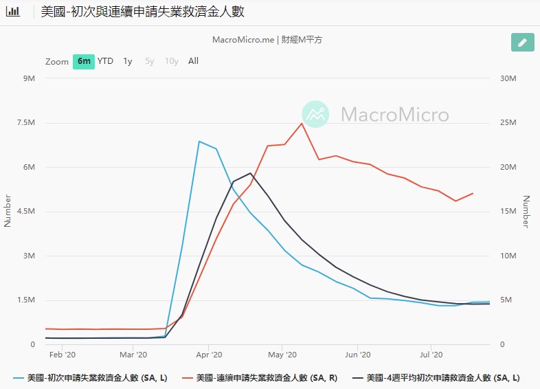 本周初領失業救濟金人數符合預期,但連續請領人數再度攀升,接下來要公布的7月非農就業數據可能不會太好看,美股近期弱勢也可能是領先反應利空,但仍需留意8/7(五)晚上美股對數據的反應。美國在進入秋冬之前疫情是否能緩和下來仍舊是關注重點。 (數據來源:財經M平方)