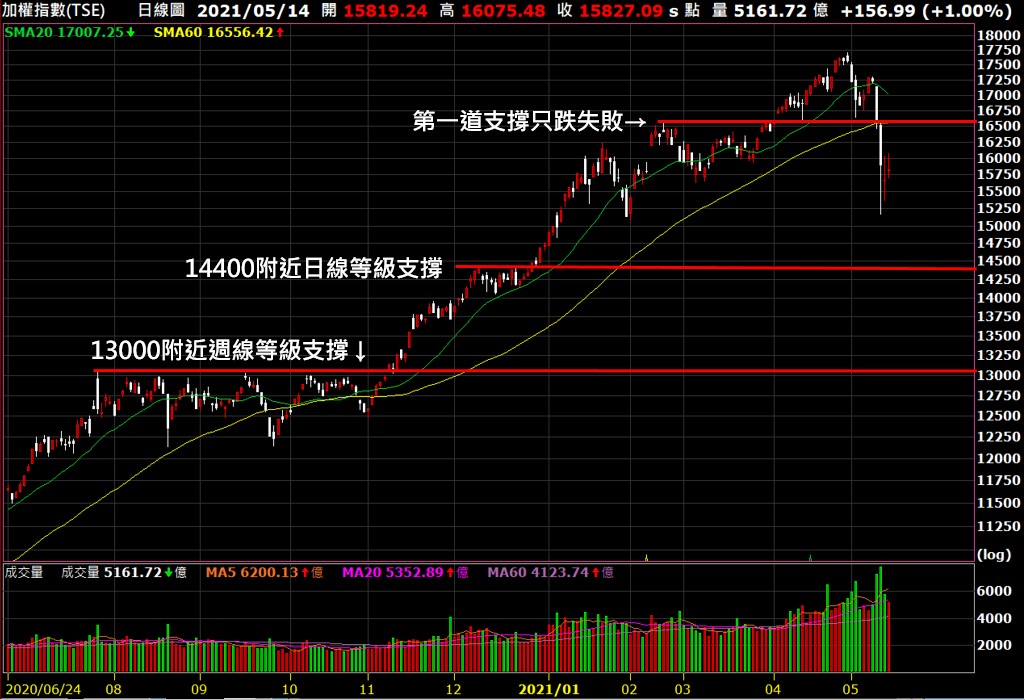 9.承5~7點分析,再因為周六單日確診180人,雙北進入第三級,因此週一開盤勢必會反應而重挫出現恐慌賣壓,就是直接看14400的撐點,而從周五收盤價15827來看,週一大盤跌停價是14244附近,不能說會跌停,但是代表週一或週二是有機會測試14400的,因此短線就要觀察14400觸及後有沒有機會開始走出止跌結構,而如果真的有到14400,短線要觀察的可能就不是小時線止跌結構,觀察重點會變成日線的空頭結構破壞,所以打底期一定會延長,月線走平也至少要一個月,所以提醒大家持續現金為王。
