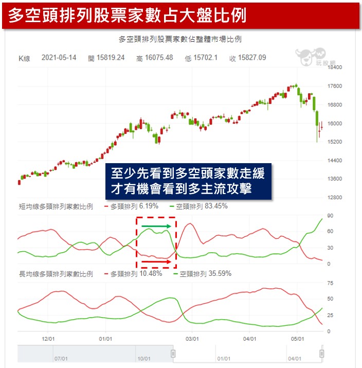 8.從均線多空頭家數佔大盤比例來看,長短均空頭都非常強勢,短線就算要翻多,至少也要先轉為平穩(見圖),因此從這點來看,短線大盤就算上漲,個股就算強彈,也仍然是非常難選股的狀態,而且也極有可能繼續雙巴(過去一週應該有感覺)只能說,接下來一至少兩週時間可能都會建議資金使用率不要超過2~3成。