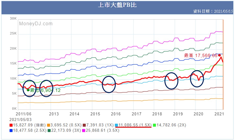 11.另外去年3月曾經提到的大盤PB比,歷史經驗來看,大致上回落到1.5倍淨值時,長線價值投資買點會浮現,但過去一年因為資金熱潮將PB頂上的前所未見的高點,而本週大跌也還沒回落到2倍的14782以內,因此短線從PB來看,其一就是短線持續失真(或過熱),其二目前也未進入價值投資區間。