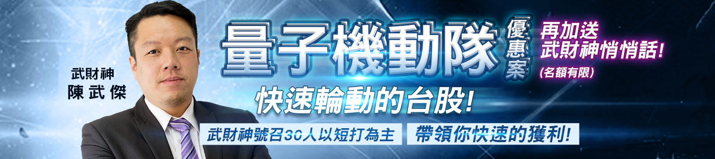 今日武財神-陳武傑分析師活動-量子機動隊優惠案! 快速輪動的台股!武財神號召30人以短打為主,帶領你快速的獲利!再加送武財神悄悄話!(名額有限) !