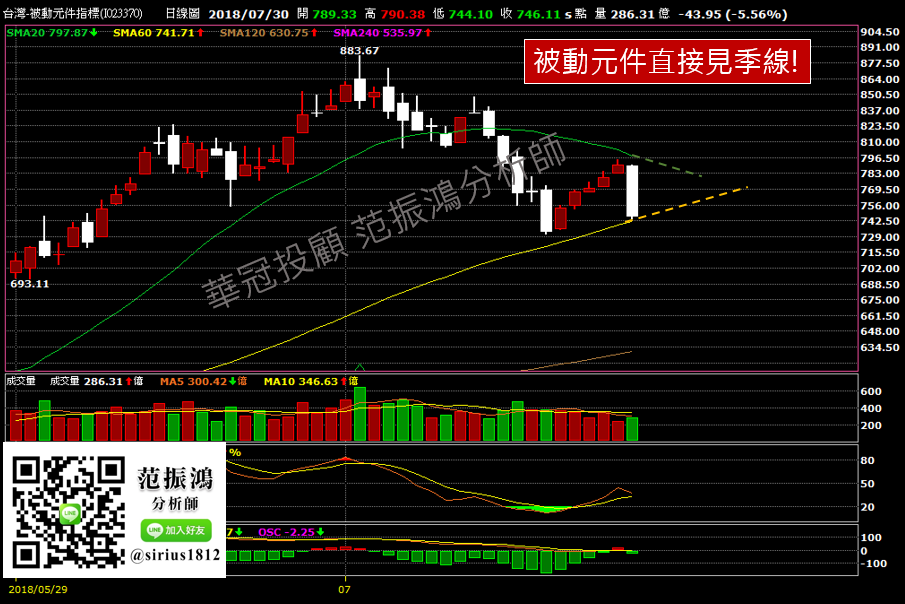 週五才提到被動元件來到月線反壓,本來只是預期本週被動將開始整理或緩步修正,沒想到是用大跌反應,上週五點名要留意的,2327國巨、2478大毅、2472立隆電、6175立敦、6173信昌電,五檔標的只有大跌或跌停兩種選項,但今天被動元件指數也跌到季線支撐了,真的也不建議追空,被動元件是有基本面跟題材的族群,只是目前線型跟籌碼轉弱,練好坐功等待機會即可。