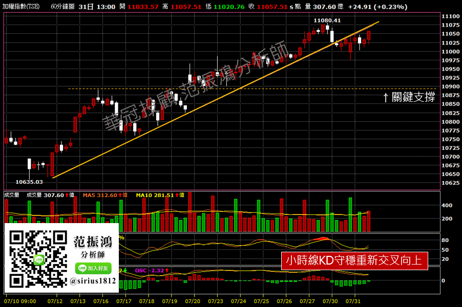 大盤今日開低走高量增收紅,量能來到1568億,打破近期量縮整理的慣性,且在昨天下跌後,小時線KD也是持續守穩50後再度黃金交叉,短線回到多方攻擊機會大增,而今天比較重要的狀況是被動續弱,資金有效轉出到其他類股,這對大盤也是正向的,若今晚信用交易狀況能夠出現資減券增的話將會更有利多方發展。