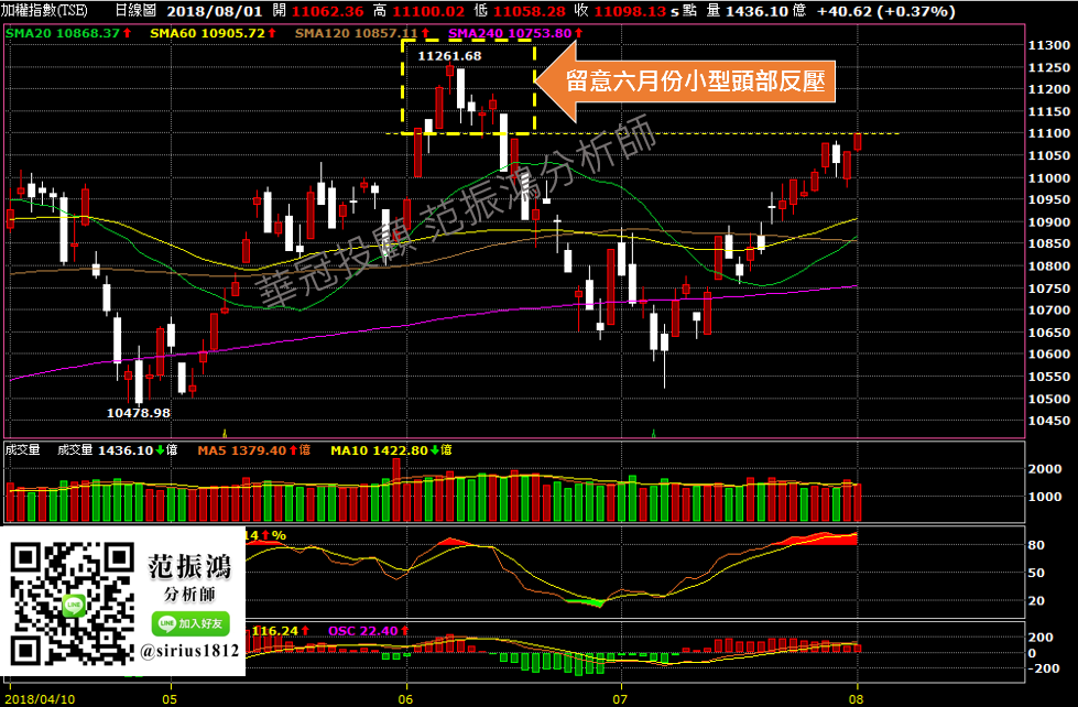 台股自突破10886後驚驚漲了近兩週,終於也來到了六月小型頭部11100反壓,畢竟這兩週是量縮漲上來的,從技術分析觀點來看,這邊只能補量硬過,不然就是要先量縮持續消耗賣壓,再攻高才會比較有機會,而從指標來看,KD在80之上也兩週左右了,接下來最有利的狀況就是修正指標但是指數小跌,等重新黃金交叉向上時,又會是一波多頭攻擊機會。