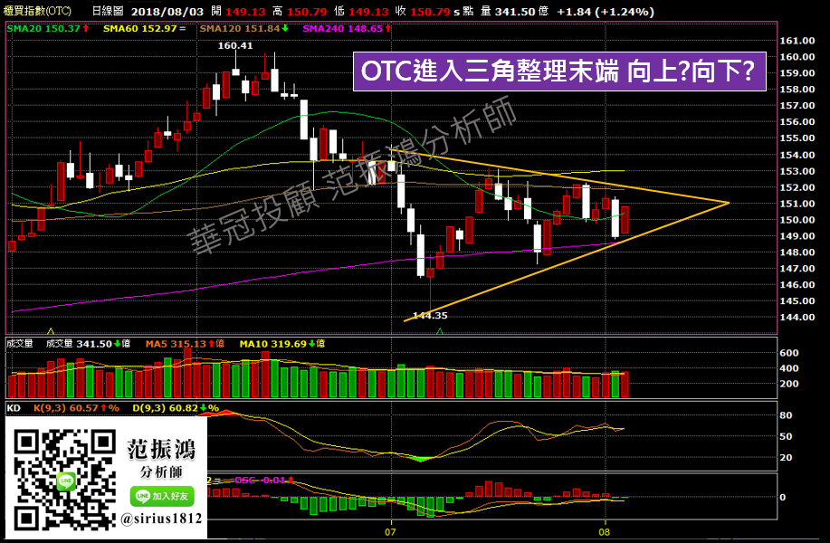昨天才提到大跌不是壞事,因為剛好修正到數個支撐附近,今天竟大漲反應也是超出我預期,但是有一點是我看錯的,就是昨天被動元件的融資並沒有洗出來,這個在短線上就不是這麼利多,因此推測接下來還是振盪盤機會高,若有挑戰前兩日高點若無法走出多頭延伸則要留意短線假突破的狀況發生。OTC的部分則是走出三角整理,同時也接近型態末端,表態的方向也是非常重要,就看加權能否延伸多頭浪帶動OTC攻擊,其實近期盤面最麻煩的就是沒有一個主流帶動,觀察的幾個族群漲勢也未見整齊的狀態,振鴻會持續幫大家注意有機會的族群,請持續追蹤振鴻的發文。