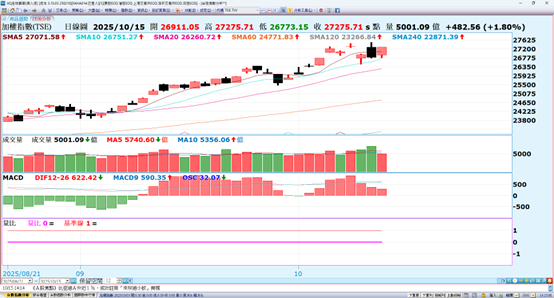台股今天小高盤開出,盤中一度翻到平盤以下,就開始一路震盪往上走,在台積電強力的表態下,昨天的大震盪長黑K今天明顯持穩下來,今天的強勢族群台積電二奈米、設備特化相關。上櫃OTC也是出現強力反彈,台股上漲482.56點,收在27275.71點,成交量為5001.09億。今上市櫃股票合計上漲家數959家、下跌716家,漲停家數31家。近期台股大震盪輪動更快更為明顯,後續的選股和資金配置靈活調整非常重要。