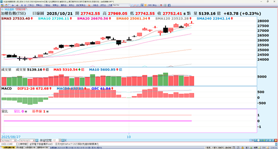 台股今天高盤開出,早盤創新高後,尾盤震盪壓回收斂漲幅,台股終場上漲63.78點,收在27752.41點,成交量為5139億。今上市櫃股票合計上漲家數975家、下跌676家,漲停家數36家。上櫃OTC指數出現近期難得強於上市的部份,值得關注。實戰操作如何在3-5檔範圍內有效配置,並捉到主升攻擊股加大部位去賺到錢。