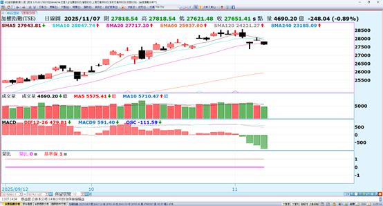 台股今天低盤開出,盤中震盪走低為主多,台股終場收盤下跌248.04點,收在27651.41點,成交量為4690.2億。今上市櫃股票合計上漲家數481家、下跌1227家,漲停家數24家。昨天台股上引線遇五日十日線交叉壓力未過,今天再測月線,顯示行情將進入區間震盪的機率變高。