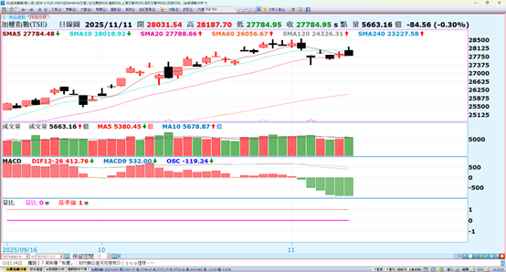 台股技術面目前MACD翻綠六天進入震盪區間,今天早盤是高盤開出,盤中震盪尾盤走低,台股終場收盤下跌84.56點,收在27784.95點,成交量為5663億。今上市櫃股票合計上漲家數774家、下跌912家,漲停家數30家。行情持續進入區間震盪的機率較高。