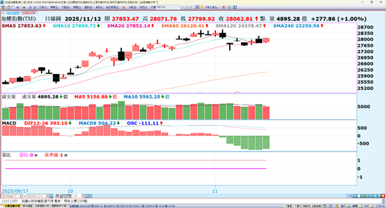 昨天美股漲跌互見,道瓊再創歷史新高,費半跌幅較重-2.4%。道瓊的上漲主要是市場押注政府停擺即將落幕的樂觀情緒帶動,費半下跌主要是日本軟體銀行宣佈出售輝達持股,加上AI資料中心營運業者CoreWeave周一調降全年營收展望,市場擔憂AI過度投資疑慮再起。