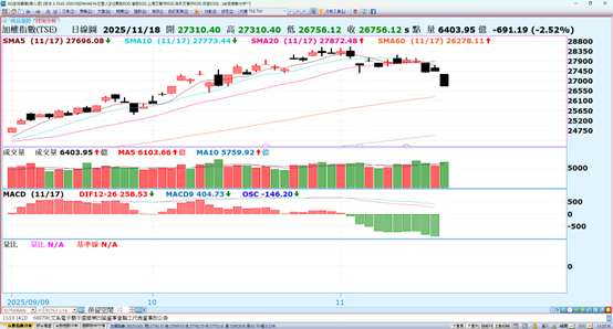 聯準會降息前景不明以及輝達財報本週三將出爐,市場屏息以待,美股四大指數都是下跌。目前市場預估12月降息的機率只有42%,這次美國政府關門很多經濟數據無法即時反應整體經濟面,接下來會陸續公布一些數據,但對降息最重要的10月份非農就業與CPI數據恐將消失,這會造成聯準會12月降息會有變數。