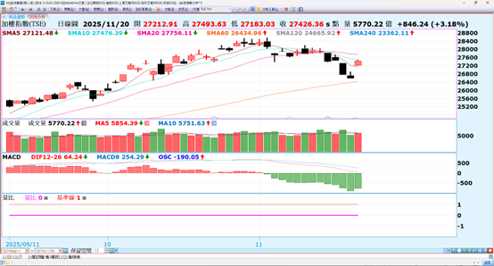 台股技術面目前MACD翻綠12個交易日,終於小縮腳,今天台股加權指數在輝達盤後利多的狀況下是高盤開出,盤中震盪後又往拉抬,台股終場收盤大漲846.24點,收在27426.36點,成交量為5770.22億。今上市櫃股票合計上漲家數1430家、下跌298家,漲停家數18家。