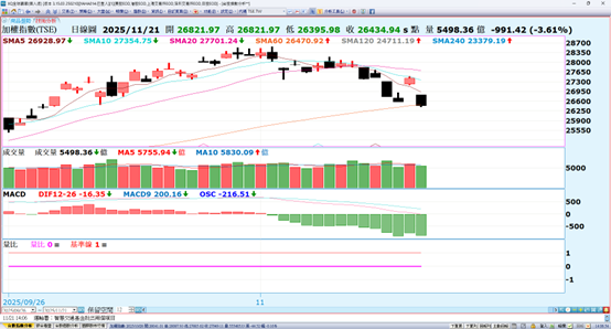 台股技術面目前MACD翻綠13個交易日,今天台股加權指數在美股大跌影響下是低盤開出,盤中開低走低,台股終場收盤下跌991.42點,收在26434.94點,成交量為5498億。今上市櫃股票合計上漲家數259家、下跌1483家,漲停家數7家。