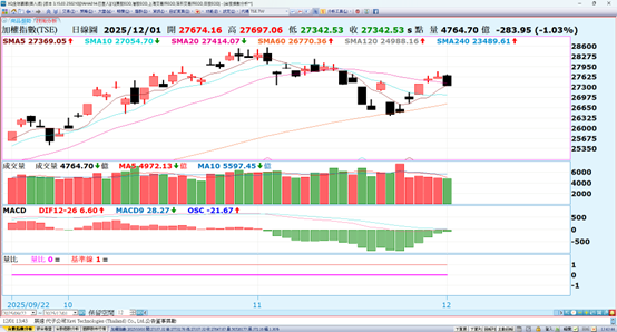 今天台股加權指數小低盤開出,盤中低檔震盪為主,台股終場收盤下跌204.31點,收在27626.48點,成交量為4393億。今上市櫃股票合計上漲家數1067家、下跌591家,漲停家數21家,