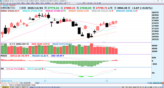 美國昨天公布有小非農之稱的ADP就業數據,創2023年初以來最大跌幅,也增強市場對聯準會下週將再次降息的預測率, FedWatch 顯示,聯準會於 12 月 9 至 10 日會議降息 1 碼的機率已接近 90%,2026 年將再降息 3 碼。美股四大指數都是續漲,未來兩天周四將公布上周初次申請失業救濟金人數,周五公布PCE以進一步研判通膨與政策動向原則上預計都對聯準會降息有利。
