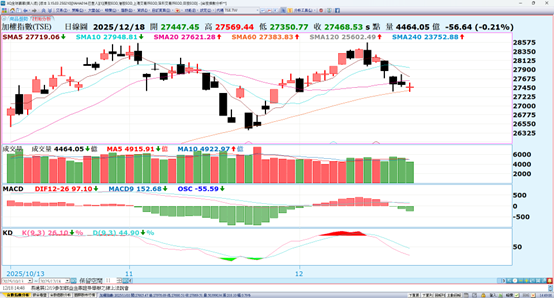 甲骨文因融資破局股價下跌5.4%,也拖累AI相關個股。高科技股和費城半導體跌幅較重跌破季線,指標MACD已翻緣加大,台股受此影響轉折向上的時間未成功,表示籌碼面的不穩定是台股多方的隱憂震盪的時間要延至月底,加上外資即將放假,台股量縮的機率變大,籌碼面的不穩定是台股多方的隱憂,需要時間消化。