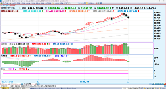 美股四大指數週五也出現震盪修正,其中費城半導體的部份-3.8%最多,漲多的黃金-10.1%、白銀-28.3%帶動了市場的賣壓,火線是川普提名華許出任下一任聯準會主席,川普長期以來一直希望聯準會能更快降息立場趨鴿派,但提名的華許在歷史上一向主張偏向鷹派的貨幣政策,讓 Fed 政策路徑平添變數,更動搖了市場對鴿派人物出線的預期與押注。