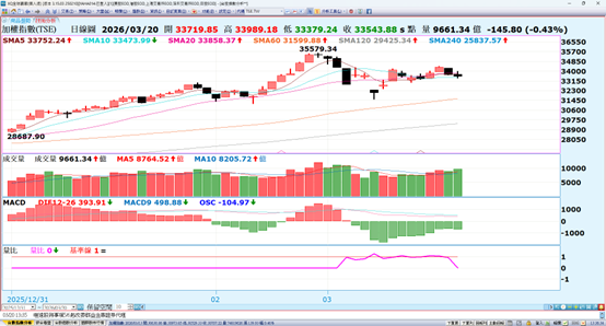台股馬年開紅盤再度創下35579.34點新歷史,近期因美伊事件變數,行情出現如預期修正到接近季線的狀況,上週一二時間轉折點已大舉進場,近期國際局勢不佳但上櫃已經連九漲創下新高但結構暫有變化,後續策略仍會針對族群資金移動,符合量線價公司進入好球帶揮擊的個股做評估,並嚴控進出節奏因應。