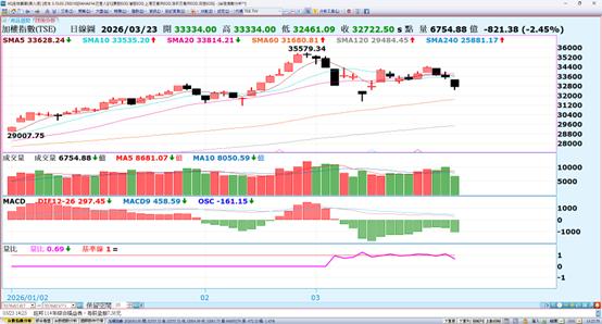 台股馬年開紅盤再度創下35579.34點新歷史,近期因美伊事件變數,行情出現正到接近季線的狀況,3/9-/310時間轉折點已大舉進場,上週五3/20行情結構出現變化,建議保留多數資金。後續策略仍會針對族群資金移動,符合量線價公司進入好球帶揮擊的個股做評估,並嚴控進出節奏因應。