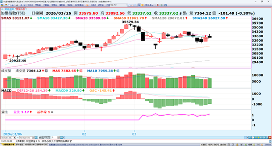台股馬年開紅盤再度創下35579.34點新歷史,近期因美伊事件變數,行情出現正到接近季線的狀況,美伊事件正式傳出停戰一個月的消息激勵台股,但因波浪修正未完成短期震盪的機會變大。後續策略將會針對族群資金移動,符合量線價公司進入好球帶揮擊的個股做評估,並嚴控進出節奏因應。