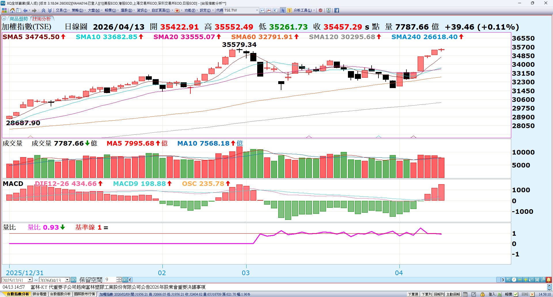 台股今天早盤低盤開出,盤中震盪走高,收盤上漲39.46點,收在35457.29點,成交量為8295億,離創歷史新高不遠。上櫃OTC仍是相對強,持續創波段新高。之前已提到台股收盤3月底已完成韋廷規劃的時間空間修正,四月已重新進入多方,目前看法不變,重點在個股,短線剩下美伊事件干擾。