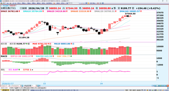 台股盤中開高走高尾盤下壓,收盤上漲154.46點,收在36958.8點,成交量為9200億,上櫃OTC持續強勢連創波段新高。之前已提到台股收盤3月底已完成韋廷規劃的時間空間修正,四月已重新進入多方,本月份台股走勢持續創歷史新高,完全驗證韋廷的推測,後續行情重點還是在個股的進出和規劃。