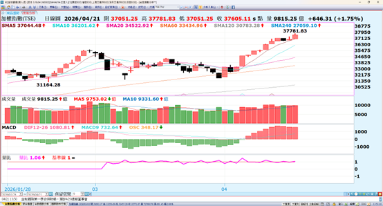 台股延續多頭氣勢,早盤開高後下壓接近10點又開始上攻,收盤上漲646.31點,收在37605.11點,成交量為9815.26億,上櫃OTC持續強勢連11紅創波段新高。之前已提到台股收盤3月底已完成韋廷規劃的時間空間修正,四月已重新進入多方,本月份台股走勢持續創歷史新高,完全驗證韋廷的推測,後續行情重點還是在個股的進出和規劃。