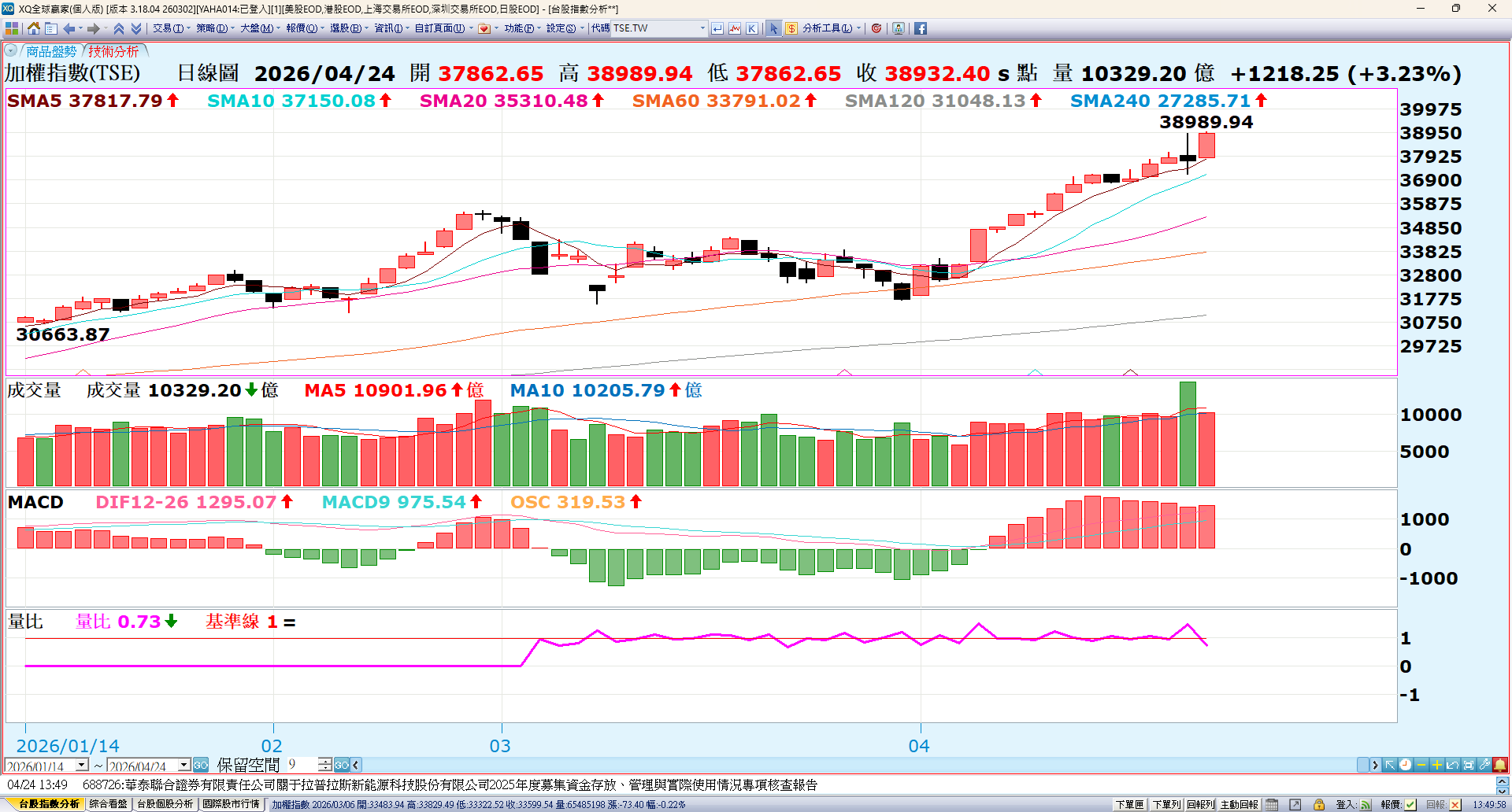 台股近期因美伊事件變數,三月份行情如先前規劃出現C波下修來到季線的狀況,本波修正後4月初預期出現多方的有效轉折,目前4月中下旬已持續創歷史新高,金管會政策新變革,後續策略將持續針對族群資金移動,符合量線價公司進入好球帶揮擊的個股做評估,並嚴控進出節奏因應。