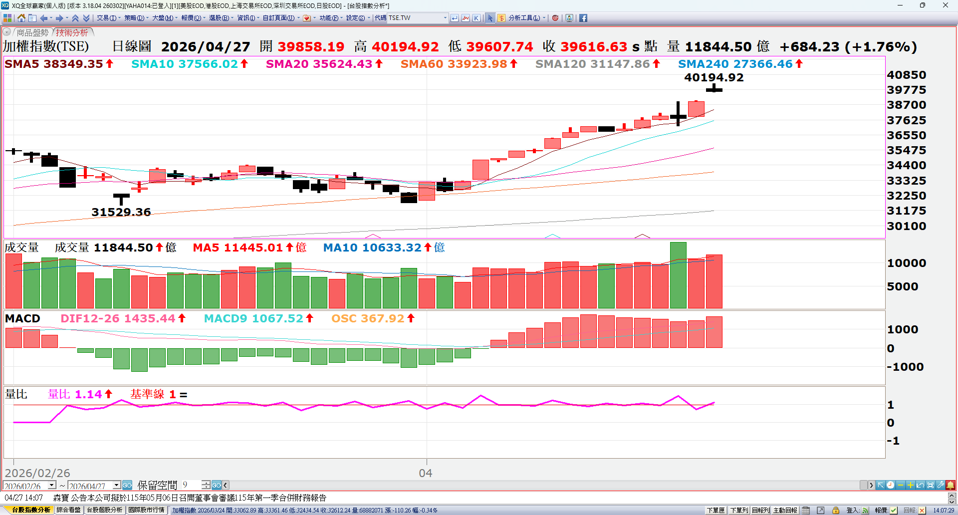 台股近期因美伊事件變數,三月份行情如先前規劃出現C波下修來到季線的狀況,本波修正後4月初預期出現多方的有效轉折,目前4月中下旬已持續創歷史新高,金管會政策新變革,後續策略將持續針對族群資金移動,符合量線價公司進入好球帶揮擊的個股做評估,並嚴控進出節奏因應。