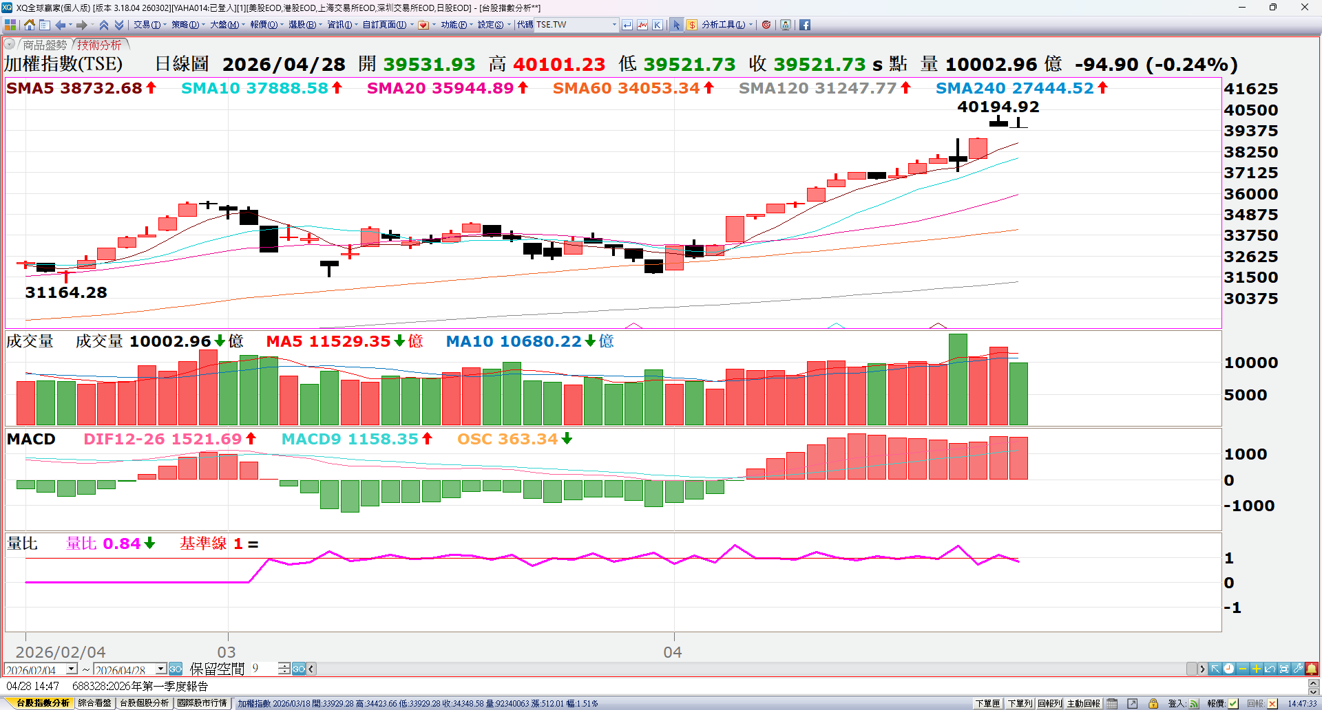 台股近期因美伊事件變數,三月份行情如先前規劃出現C波下修來到季線的狀況,本波修正後4月初預期出現多方的有效轉折,目前4月底已持續創歷史新高,金管會政策新變革,後續策略將持續針對族群資金移動,符合量線價公司進入好球帶揮擊的個股做評估,並嚴控進出節奏因應。