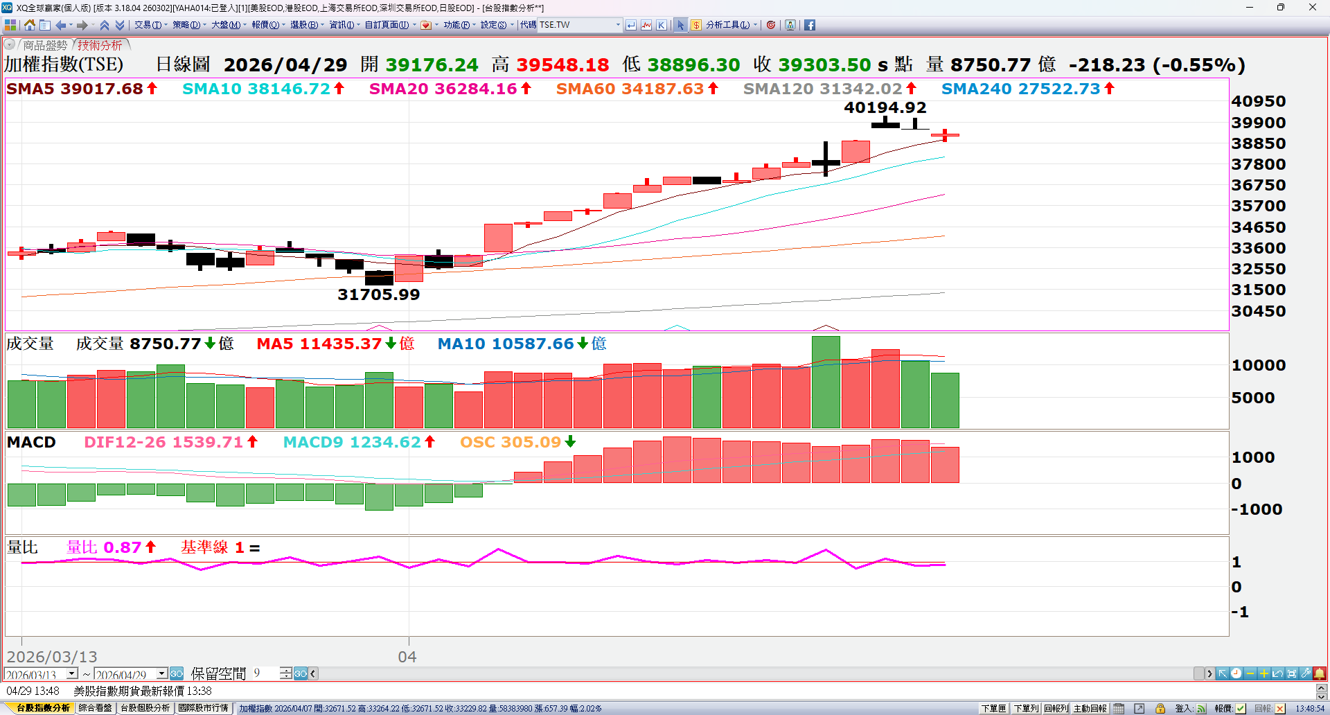 台股近期因美伊事件變數,三月份行情如先前規劃出現C波下修來到季線的狀況,本波修正後4月初預期出現多方的有效轉折,目前4月底已持續創歷史新高震盪加大。後續策略將持續針對族群資金移動,符合量線價公司進入好球帶揮擊的個股做評估,並嚴控進出節奏因應。
