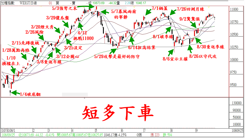 『中美貿易戰』嚇不倒,今天台股卻被新的黑天鵝『川普彈劾案』;嚇到短線跌破十日均線。雖然指數空間不大,但十日均線是『驚驚漲』結構的關鍵;導致早盤跌破十日均線後,盤勢出現『短多下車』的情況。因為今天是由『川普彈劾案』利空摜破,所以『驚驚漲』的結構,還是有『敗部復活』的機會。反之…就算美股不作美,明天無法重返十日均線;預料多頭結構會先在10800-11000區間震盪,等待籌碼清洗後,盤勢換檔再上。