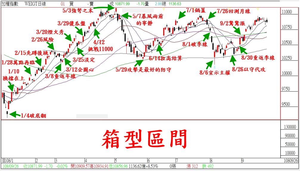 延續我們昨天說的…今天如果無法重返十日均線;預料多頭結構會先在10800-11000區間震盪,等待籌碼清洗後,盤勢換檔再上。加權指數在欠缺追價買盤下,『短多下車』的情況沒有停手;導致今天只有少數權值股撐盤。雖然指數跌幅不大,但這就是黑手『企圖心』的表現;明天是『摩台結算日』,內資短線明顯站在觀望,這裡我們就不預測明天走勢。但就今天多頭『企圖心』來看,台股在大漲700點後,短線可望進入休息;預估接下盤勢會落在10800-11000的『箱型區間』震盪整理。