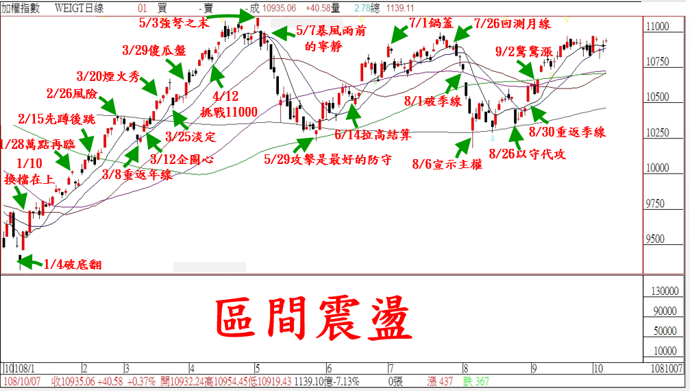 美股的爆漲,雖然給了多頭強攻11000點的機會;但是整體來看…武傑還是老話一句:『風不動、是投資人的心在動』。延續我們上星期說的…10/2美股的大跌,對台股而言是『利空測試』10800的機會;所以上星期五美股的大漲,就是視為多頭挑戰11000點的企圖心。以今天指數小漲+40點來看,整體台股還是沒有改變『區間震盪』格局;所以10月上旬指數的波動,我們視為『消息面』的反應,並不用過度預期。投資朋友的重點還是放在類股的輪動,鎖定好股…『反市場操作』!!!