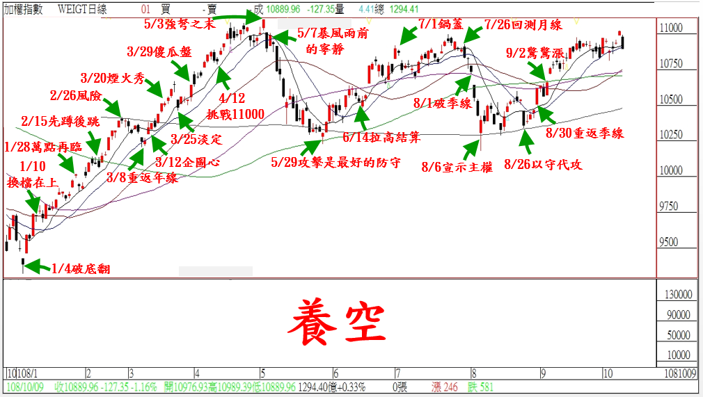 昨天我們才說…內資明顯逢高減碼,如果只是外資硬撐台積電的方法,恐怕也是來的快、去的快;今天馬上重挫-127點,昨天漲的都不夠跌。接下來就『雙十連假』了,基本上台股比沒有太多分析空間;一如果我們先前說的…短線的震盪都是反應『消息面』變化。所以重點是黑手心態沒有改變,整體的台股依舊還是『區間震盪』格局;而有投資人問:『那要震盪到何時?』。關於這個目題…就是台股『養空』的情況囉!!